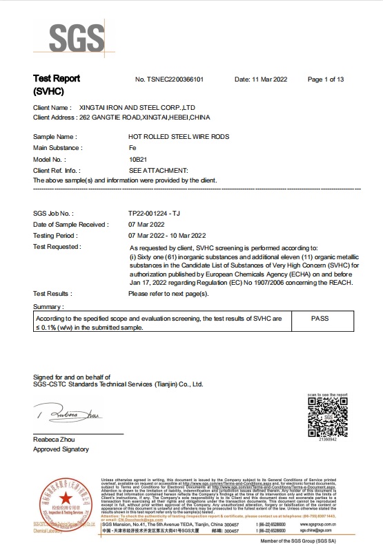 - RoHS and SVHC not detected in the wire rod by Xingtai Steel