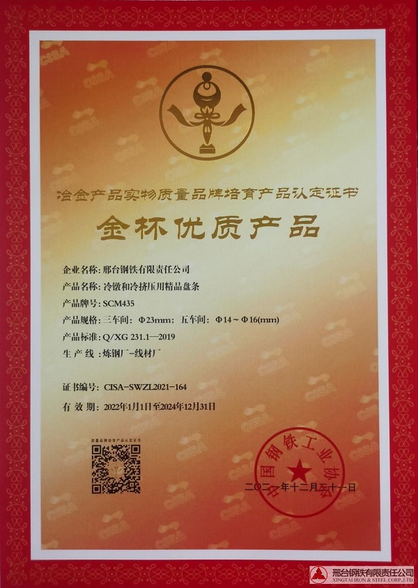 冷鐓和冷擠壓用精品盤條SCM435φ23mm;φ14-φ16mm規(guī)格獲冶金產(chǎn)品實物質(zhì)量金杯優(yōu)質(zhì)產(chǎn)品認定證書