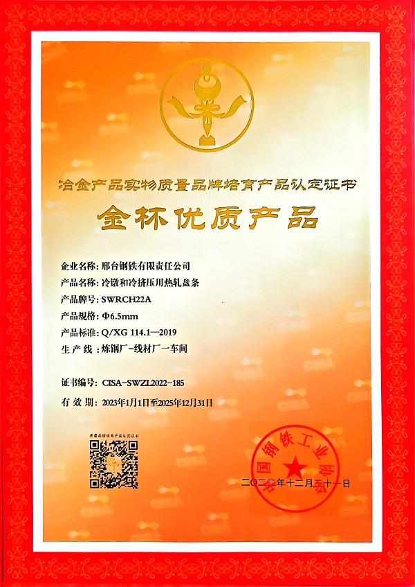 冷鐓和冷擠壓用熱軋盤條SWRCH22Aφ6.5mm規(guī)格獲冶金產(chǎn)品實物質(zhì)量金杯優(yōu)質(zhì)產(chǎn)品認定證書