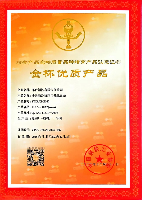 冷鐓和冷擠壓用熱軋盤條SWRCH35Kφ6.5-φ12mm規(guī)格獲冶金產(chǎn)品實物質(zhì)量金杯優(yōu)質(zhì)產(chǎn)品認定證書