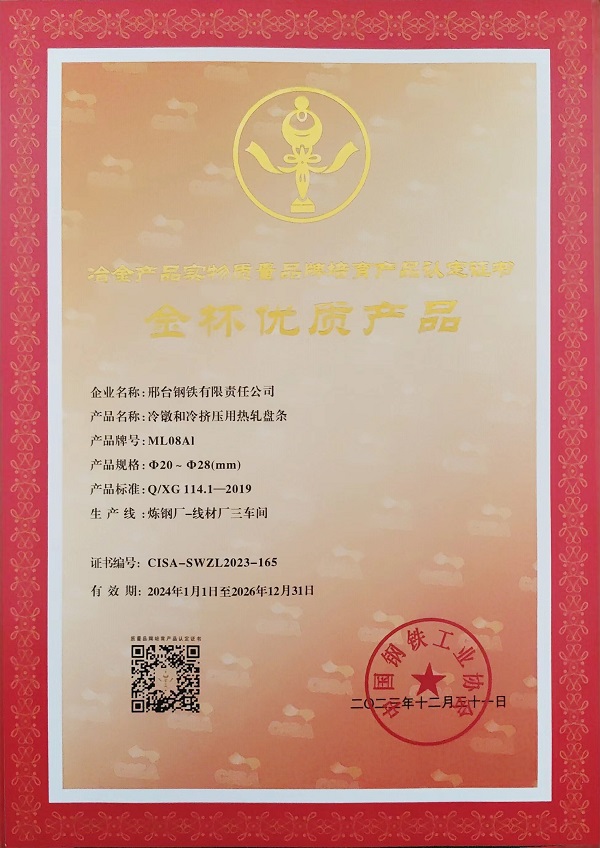 冷鐓和冷擠壓用熱軋盤條ML08Alφ20-φ28mm規(guī)格獲冶金產(chǎn)品實物質(zhì)量金杯優(yōu)質(zhì)產(chǎn)品認定證書