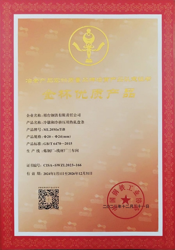 冷鐓和冷擠壓用熱軋盤條ML20MnTiBφ20-φ24mm規(guī)格獲冶金產(chǎn)品實物質(zhì)量金杯優(yōu)質(zhì)產(chǎn)品認定證書