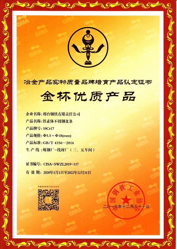 邢鋼鐵素體不銹鋼盤條10Cr17 φ5.5-18mm規(guī)格獲冶金產(chǎn)品實(shí)物質(zhì)量金杯優(yōu)質(zhì)產(chǎn)品認(rèn)定證書