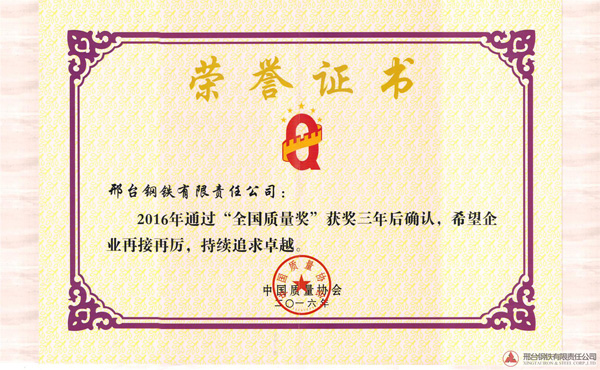 邢鋼于2013年獲得全國質(zhì)量獎(jiǎng),獲獎(jiǎng)后邢鋼繼續(xù)實(shí)踐《卓越績(jī)效評(píng)價(jià)準(zhǔn)則》,深入推進(jìn)卓越績(jī)效管理模式,持續(xù)改進(jìn),不斷追求卓越。2016年9月全國質(zhì)量獎(jiǎng)評(píng)審活動(dòng)領(lǐng)導(dǎo)小組組織專家對(duì)邢鋼進(jìn)行了全國質(zhì)量獎(jiǎng)獲獎(jiǎng)三年后的現(xiàn)場(chǎng)確認(rèn),通過專家小組的現(xiàn)場(chǎng)提問、材料匯報(bào)、生產(chǎn)現(xiàn)場(chǎng)的參觀,邢鋼順利通過了“全國質(zhì)量獎(jiǎng)”獲獎(jiǎng)三年后確認(rèn)并頒發(fā)證書。
