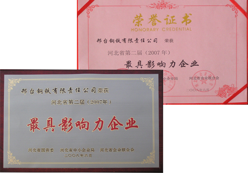 2008年12月,邢鋼“三人”注冊商標(biāo)被河北省工商行政管理局認(rèn)定為河北省著名商標(biāo)。