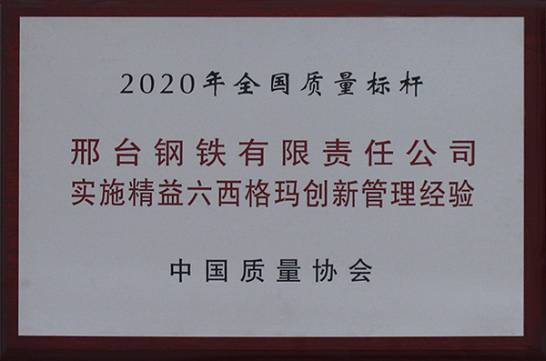 2020年10月21日,由中國質量協(xié)會主辦,山西省工業(yè)和信息化廳、太原市人民政府承辦的“2020年全國質量標桿山西行交流活動”在山西省太原市舉辦,在本次交流活動上邢鋼《實施精益六西格瑪創(chuàng)新管理經(jīng)驗》被授予“2020年全國質量標桿”。