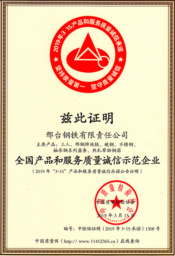 2019年3月15日,邢鋼(主要產(chǎn)品:三人、邢鋼牌純鐵、碳鋼、不銹鋼、軸承鋼系列盤條,熱軋帶肋鋼筋),被中國質(zhì)量檢驗(yàn)協(xié)會授予“全國產(chǎn)品和服務(wù)質(zhì)量誠信示范企業(yè)”稱號。