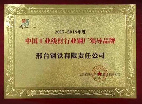 2018年10月22日,在上海舉辦的“2018年Mysteel中國工業(yè)線材暨緊固件產(chǎn)業(yè)鏈高峰論壇”上,論壇評委會根據(jù)對國內(nèi)工業(yè)線材生產(chǎn)鋼廠2017-2018年品牌、質(zhì)量和市場反饋等評比,評選出“中國工業(yè)線材行業(yè)鋼廠領(lǐng)導品牌”,邢鋼獲此殊榮。