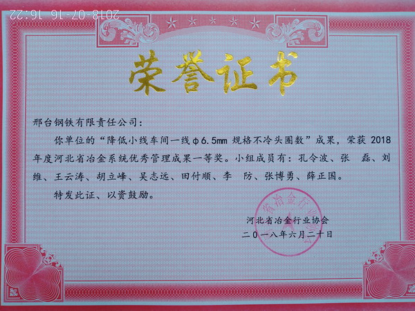 河北省冶金行業(yè)協(xié)會于6月份在秦皇島召開了“全省冶金行業(yè)質(zhì)量管理優(yōu)秀成功發(fā)布會”,邢鋼線材廠小線車間工藝技術(shù)QC小組《降低小線車間一線6.5mm規(guī)格不冷頭圈數(shù)》在發(fā)布會上進(jìn)行了成功發(fā)布,獲得本次發(fā)布會一等獎的好成績。