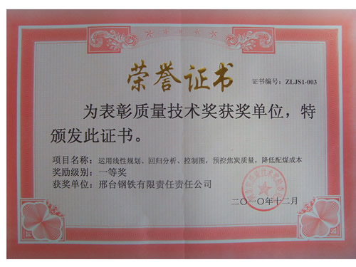 近日獲悉,我公司申報的“運用線性規(guī)劃、回歸分析、控制圖預控焦炭質量,降低配煤成本”質量技術成果,經河北省質量技術獎勵委員會評選,獲得一等獎。該項目是焦化廠運用質量統(tǒng)計技術工具經過實踐取得的一項質量技術成果。通過實施該項目,配合煤成本比2008年降低了4775萬元,保持了焦炭質量的持續(xù)穩(wěn)定。