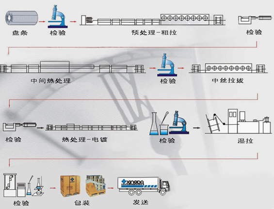 Ф5.5mm 盤(pán)條→預(yù)處理→粗拉→中絲熱處理(奧氏體化→索氏體化)→表面處理→中拉→成品前熱處理(奧氏體化→索氏體化)→表面處理→電鍍→熱擴(kuò)散→濕拉→檢驗(yàn)→包裝入庫(kù)。