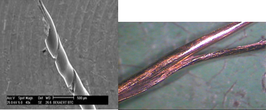 主要是指鋼絲在Bunching機器中由于鋼絲的塑性不夠,在扭轉(zhuǎn)時造成鋼絲呈螺旋狀分層斷裂,這主要發(fā)生在粗規(guī)格以及高強度直徑上。