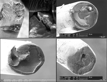 • 一般脆斷發(fā)生在濕拉的校直器和Bunching, 當(dāng)鋼絲在扭轉(zhuǎn)或者彎曲的時候,有內(nèi)含物的鋼絲就發(fā)生斷裂。