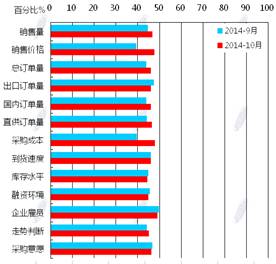 =鋼鐵市場活躍度略有好轉(zhuǎn)。10月銷售量指數(shù)為46.6%,較上月上升2.1個百分點(見圖3),表明10月份鋼貿(mào)企業(yè)銷售量增加,鋼鐵流通市場活躍度略有好轉(zhuǎn)。進入10月,隨著鋼鐵原料鐵礦石及鋼坯價格的先漲后跌,鋼材市場價格也呈現(xiàn)先漲后跌走勢,市場成交總體有所好轉(zhuǎn)。從區(qū)域看,六大區(qū)域銷售量指數(shù)除東北、西北地區(qū)有所下降外,其余地區(qū)均出現(xiàn)不同程度的回升。