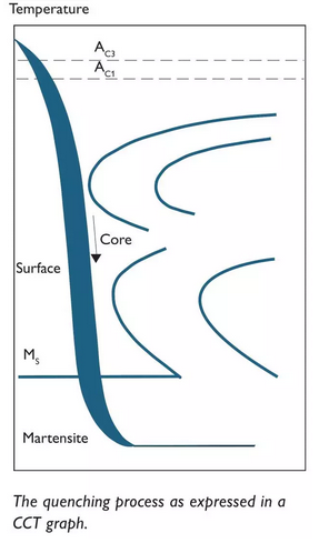 不良的淬火速率將導(dǎo)致在部件芯部的晶粒邊界處的碳化物沉淀,并且這對(duì)鋼的機(jī)械性能非常不利的。此外,對(duì)于具有較大橫截面的工具,較大部件的表面處所獲得的硬度可以比較小部件的更低,因?yàn)閺男静總鬟f至表面的大量熱量會(huì)產(chǎn)生自回火效應(yīng)。