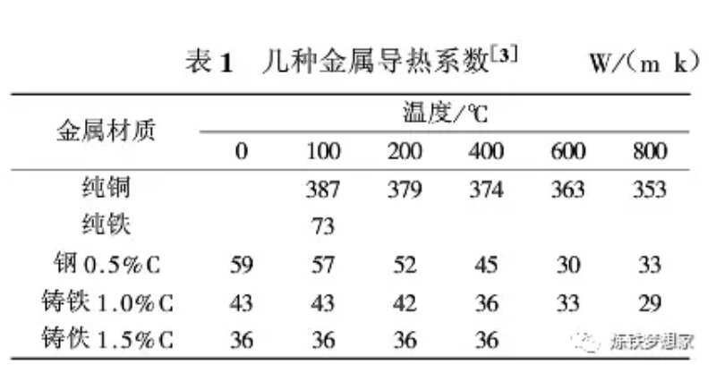 2000年以來銅冷卻壁以其良好的導(dǎo)熱能力和形成渣皮能力在我國高爐上得到廣泛的使用,目前全國約200座以上的高爐采用銅冷卻壁,尤其是在爐腹、爐腰和爐身下部等熱負(fù)荷較高的區(qū)域。高爐冷卻壁主要包括鑄鐵和純銅,另外還出現(xiàn)過鑄鋼冷卻壁。鑄鐵冷卻壁抗熱震性能差、導(dǎo)熱系數(shù)低。另外,其冷卻水管是鑄入鑄鐵本體內(nèi)的,由于材質(zhì)和膨脹系數(shù)的不同,形成氣隙層,而影響了傳熱。這些缺陷限制了鑄鐵冷卻壁的進一步發(fā)展。因此,從上世紀(jì)70年代歐洲開發(fā)和使用了銅冷卻壁,得到較好的效果。表1為幾種不同金屬導(dǎo)熱系數(shù),可以看出純銅的導(dǎo)熱系數(shù)遠優(yōu)于其他材料。