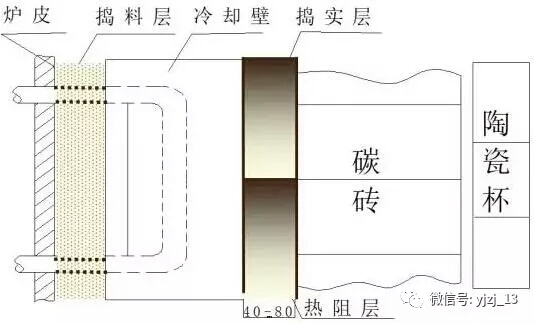 高爐爐缸由外至內(nèi)通常包括爐皮、搗料層、冷卻壁、搗實(shí)層、碳磚、陶瓷杯、黏土磚等,其中,黏土磚在高爐開爐后2個(gè)月內(nèi)脫落。高爐正常生產(chǎn)時(shí)爐缸鐵水與爐墻陶瓷杯或碳磚之間生成一層爐渣、鐵水、碳磚、含鈦難融物組成的保護(hù)層,這就是我們所說的“高爐爐缸自保護(hù)層”。