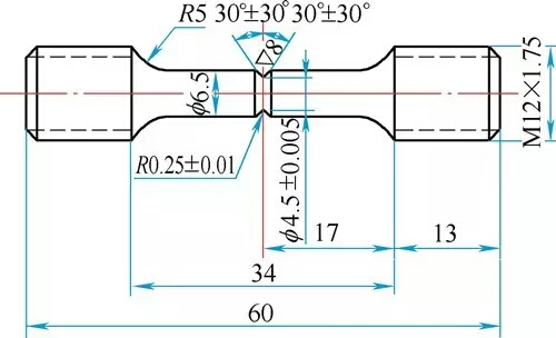 第三,試樣的制造。按圖沿材料的順纖維方向加工試樣,粗加工后熱處理至所要求的抗拉強度,然后精加工至規(guī)定尺寸,缺口用中軟細粒氧化鋁砂輪磨制。磨削時應(yīng)保證缺口根部半徑圓滑。磨削后投影檢查,確保缺口尺寸符合圖紙要求。逐根測量缺口根部直徑(圖中為φ4.5?0.05mm)的尺寸,并做好編號記錄。