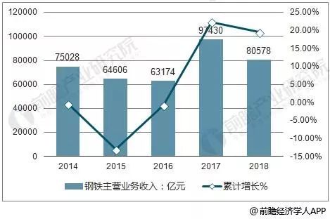 據(jù)前瞻產(chǎn)業(yè)研究院發(fā)布的《中國鋼鐵行業(yè)發(fā)展前景與投資戰(zhàn)略規(guī)劃分析報告》指出,2018上半年中國鋼鐵行業(yè)主營業(yè)務收入達到30525億元,累計增長15.8%。回顧2012-2017年鋼鐵行業(yè)營業(yè)收入情況:近六年來,我國鋼行業(yè)營業(yè)收入較為穩(wěn)定,2015年以來累計增長率逐漸回暖。中國鋼鐵行業(yè)將繼續(xù)保持穩(wěn)中有長趨勢,預計2018年中國鋼鐵行業(yè)營收將突破80000億元。