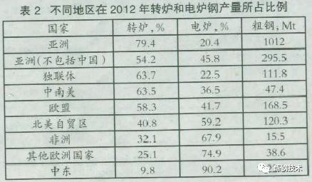 雖然電弧爐煉鋼產(chǎn)量沒有超過全球粗鋼總產(chǎn)量的三分之一(在2012年占29.3%),但由于中國(guó)在世界鋼產(chǎn)量的主導(dǎo)地位(占世界總量的46%),且它主要使用氧氣煉鋼,電弧爐煉鋼的影響被忽略,表2顯示了在2012年不同地區(qū)轉(zhuǎn)爐煉鋼及電弧爐煉鋼的相對(duì)比例。