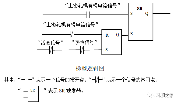 在軋件頭部進(jìn)入活套后面軋機(jī)前不允許起套輥升起;在軋件頭部進(jìn)入活套后面軋機(jī)后起套輥必須立即升起。當(dāng)軋件尾部離開(kāi)活套前面軋件時(shí),起套輥必須立即下降。為了準(zhǔn)確地起落套,我們首先,在活套的起落套的邏輯控制程序中設(shè)置了RS觸發(fā)器。只要下游機(jī)架“有鋼”活套就不能再次起落套。編程如下(梯型邏輯圖):其次,在起套和落套的處理上對(duì)延時(shí)時(shí)間采用了長(zhǎng)度系數(shù)補(bǔ)償?shù)乃惴?,即在?jì)算定時(shí)器的延時(shí)時(shí)間過(guò)程中將線(xiàn)材要走的長(zhǎng)度(如兩機(jī)架間的距離)乘以一個(gè)百分比。這樣就可以:一、消除由于CPU軟件系統(tǒng)本身運(yùn)行周期過(guò)長(zhǎng)造成的定時(shí)計(jì)算誤差;二、靈活地適應(yīng)電氣開(kāi)關(guān)和機(jī)械上氣閥等的動(dòng)作滯后的不一致性,以使起套輥能較準(zhǔn)確地升起和落下。