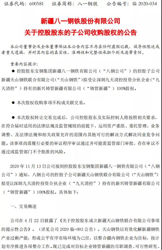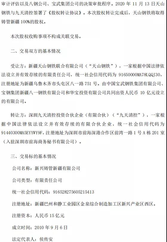 11月13日晚間,八一鋼鐵發(fā)布公告稱,該公司控股股東寶鋼集團新疆八一鋼鐵有限公司的控股子公司新疆天山鋼鐵聯合有限公司擬受讓深圳九天清控投資合伙企業(yè)持有的新興鑄管新疆有限公司100%股權。11月13日,天山鋼鐵與九天清控簽署了《股權轉讓協(xié)議》。本次股權轉讓以2019年12月31日為基準日,以公司經天健會計師事務所審計、北京中企華資產評估有限責任公司評估后的100%股權價值為基礎,各方協(xié)商確定本次股權轉讓價款為21.81億元。