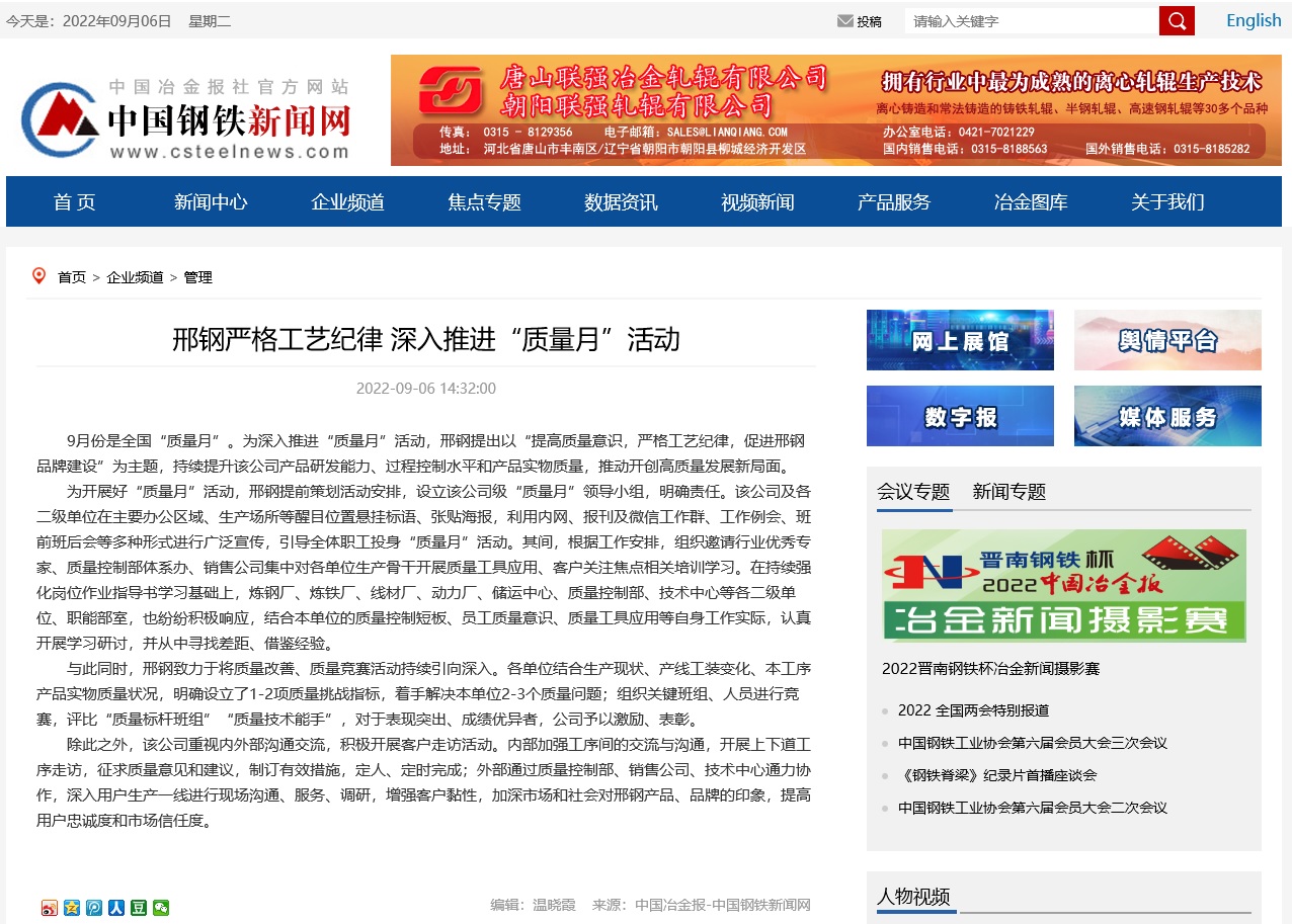 9月份是全國“質(zhì)量月”。為深入推進“質(zhì)量月”活動,邢鋼提出以“提高質(zhì)量意識,嚴格工藝紀律,促進邢鋼品牌建設”為主題,持續(xù)提升該公司產(chǎn)品研發(fā)能力、過程控制水平和產(chǎn)品實物質(zhì)量,推動開創(chuàng)高質(zhì)量發(fā)展新局面。