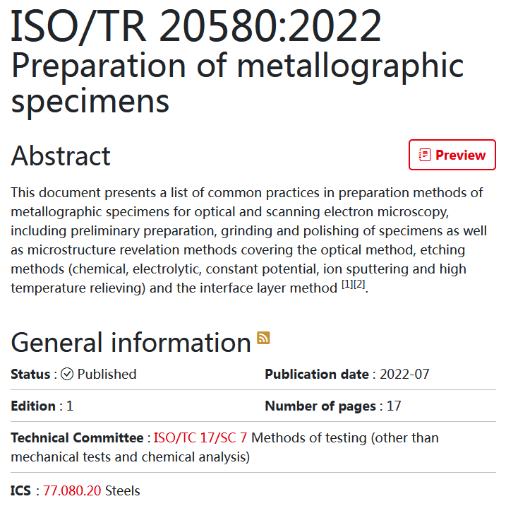 ISO/TR 20580:2022 Preparation of metallographic specimens《金相試樣的制備》國(guó)際標(biāo)準(zhǔn)近日批準(zhǔn)發(fā)布,這是由我國(guó)主導(dǎo)制定的又一項(xiàng)金相檢驗(yàn)領(lǐng)域國(guó)際標(biāo)準(zhǔn)。