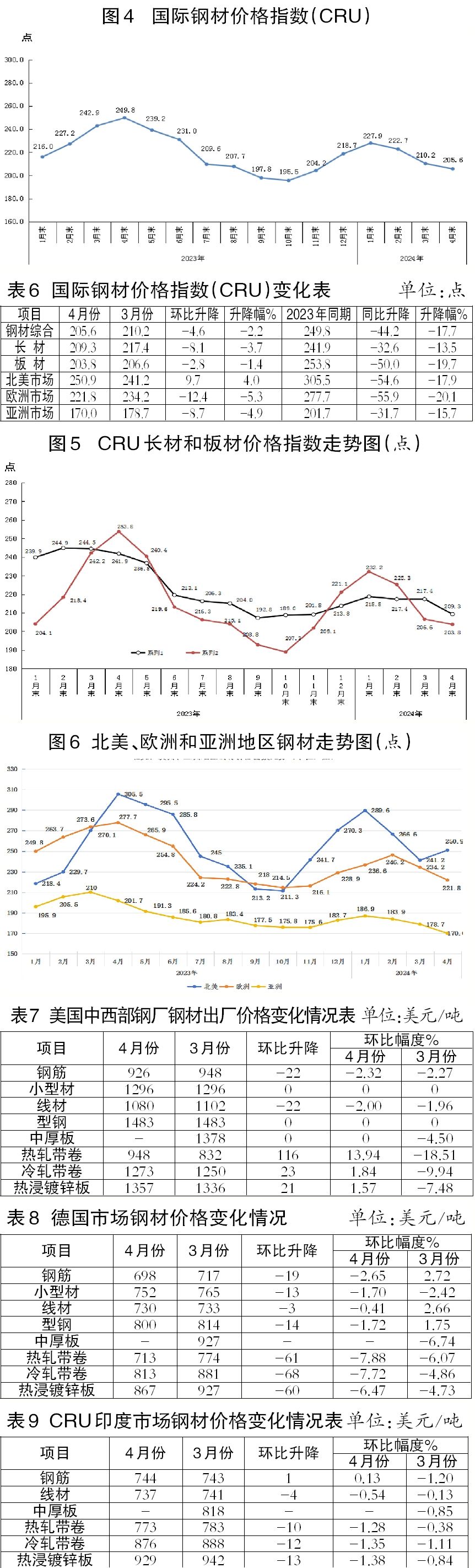 1月—4月份,CRU國際鋼材價格指數(shù)平均值為216.6點,同比下降17.4點,降幅為7.4%。