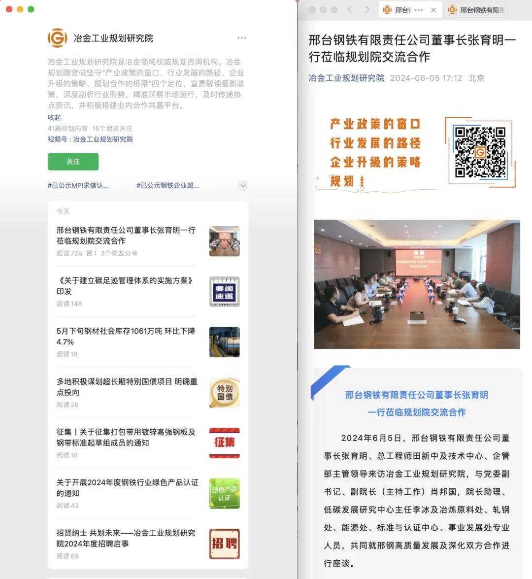 2024年6月5日,邢臺鋼鐵有限責(zé)任公司黨委書記、董事長張育明在總工程師兼董事長、總經(jīng)理助理田新中及技術(shù)中心、企管部相關(guān)負責(zé)人的陪同下,到訪冶金工業(yè)規(guī)劃研究院,與黨委副書記、副院長(主持工作)肖邦國,院長助理、低碳發(fā)展研究中心主任李冰及冶煉原料處、軋鋼處、能源處、標準與認證中心、事業(yè)發(fā)展處專業(yè)人員,共同就邢鋼高質(zhì)量發(fā)展及深化雙方合作進行座談。