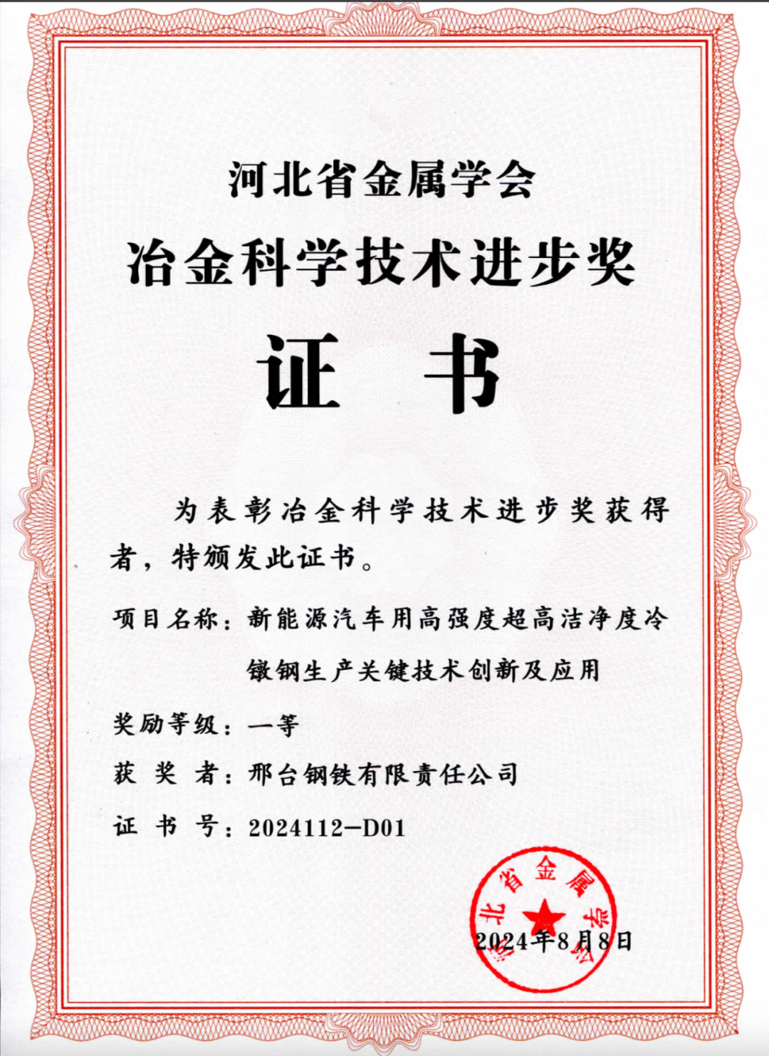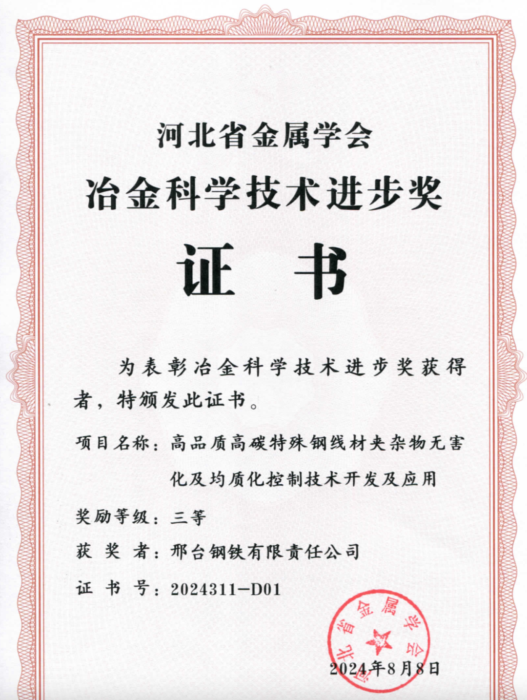 近日,邢臺鋼鐵有限責(zé)任公司兩項(xiàng)科技成果“新能源汽車用高強(qiáng)度超高潔凈度冷鐓鋼生產(chǎn)關(guān)鍵技術(shù)創(chuàng)新及應(yīng)用”“高品質(zhì)高碳特殊鋼線材夾雜物無害化及均質(zhì)化控制技術(shù)開發(fā)及應(yīng)用”得到河北省金屬學(xué)會專家評審委員會的高度認(rèn)可,分別榮獲2024年度 “河北冶金科學(xué)技術(shù)獎”一、三等獎。