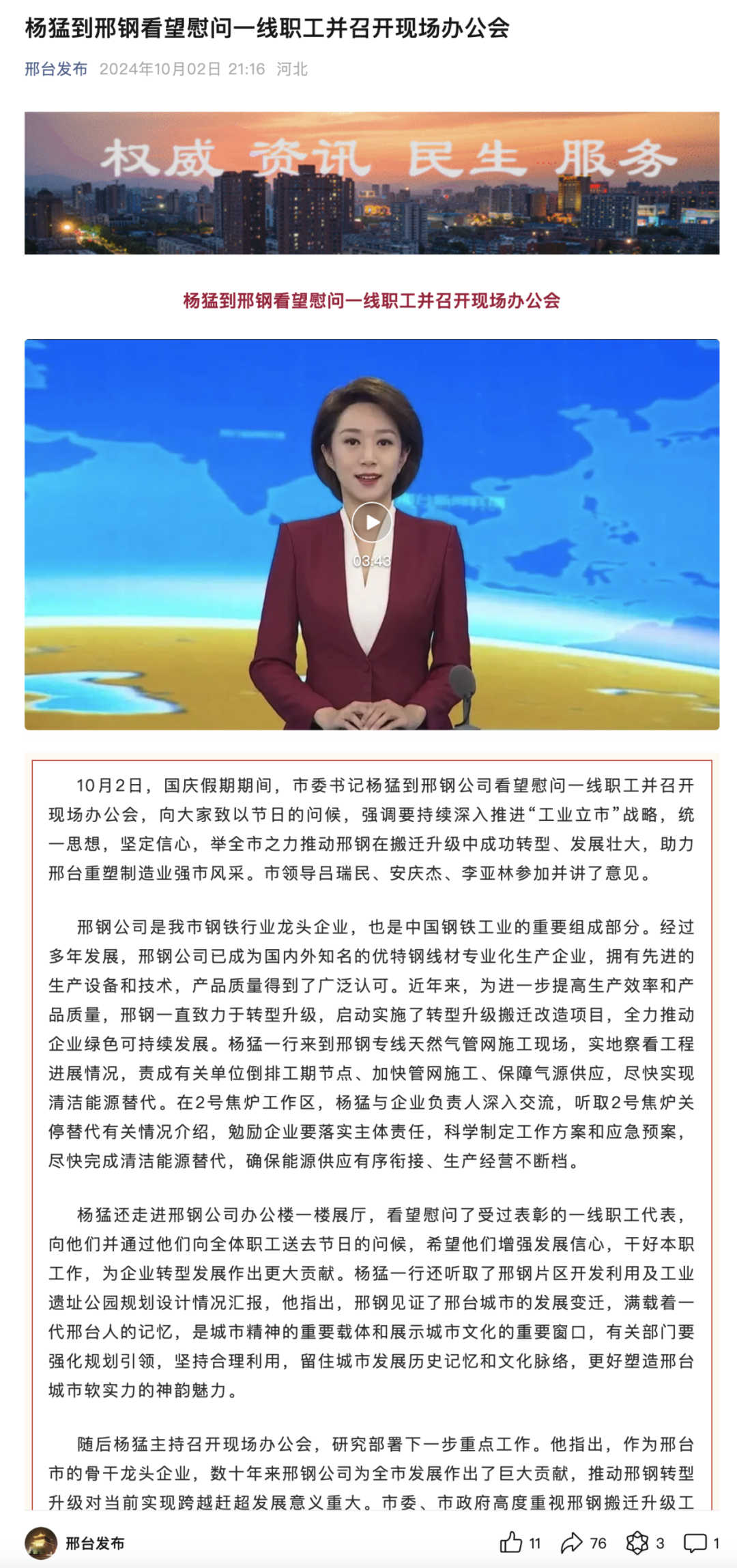隨后楊猛主持召開現(xiàn)場辦公會,研究部署下一步重點(diǎn)工作。他指出,作為邢臺市的骨干龍頭企業(yè),數(shù)十年來邢鋼公司為全市發(fā)展作出了巨大貢獻(xiàn),推動(dòng)邢鋼轉(zhuǎn)型升級對當(dāng)前實(shí)現(xiàn)跨越趕超發(fā)展意義重大。市委、市政府高度重視邢鋼搬遷升級工作,專門成立了協(xié)調(diào)督導(dǎo)工作組,督辦推進(jìn)各項(xiàng)重點(diǎn)工作,有力推動(dòng)邢鋼搬遷升級步伐。各級各有關(guān)部門要提高認(rèn)識,市、區(qū)、企配合協(xié)作,科學(xué)制定預(yù)案,確保按期、平穩(wěn)、安全關(guān)停2號焦?fàn)t,完成清潔能源替代過渡,最大限度實(shí)現(xiàn)現(xiàn)有廠區(qū)的安全綠色生產(chǎn)。要整合政策資源,創(chuàng)新思路舉措,為邢鋼搬遷升級項(xiàng)目順利實(shí)施提供有力支持。要加強(qiáng)組織領(lǐng)導(dǎo),配優(yōu)工作專班,壓實(shí)屬地責(zé)任、部門責(zé)任和企業(yè)責(zé)任,加強(qiáng)對接溝通,堅(jiān)持一事一議,積極主動(dòng)作為,形成推動(dòng)邢鋼搬遷升級的攻堅(jiān)合力。要加強(qiáng)宣傳引導(dǎo),及時(shí)客觀準(zhǔn)確向社會公布邢鋼搬遷升級項(xiàng)目建設(shè)實(shí)況,營造社會各界支持邢鋼發(fā)展的良好氛圍。