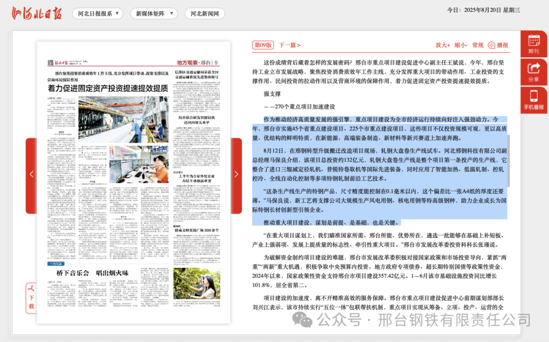 8月12日,在邢鋼轉(zhuǎn)型升級搬遷改造項(xiàng)目現(xiàn)場,軋鋼大盤卷生產(chǎn)線試車。河北邢鋼科技有限公司副總經(jīng)理馬保良介紹,該項(xiàng)目總投資約132億元,軋鋼大盤卷生產(chǎn)線是整個(gè)項(xiàng)目第一條投產(chǎn)的生產(chǎn)線,它整合了進(jìn)口三輥減定徑軋機(jī)、普銳特卷取機(jī)等國際先進(jìn)裝備,同時(shí)應(yīng)用了智能加熱、低溫軋制、控軋控冷、全線自動化控制等多項(xiàng)特鋼軋制前沿工藝技術(shù)。“這條生產(chǎn)線生產(chǎn)的特鋼產(chǎn)品,尺寸精度能控制在0.1毫米以內(nèi),這個(gè)偏差比一張A4紙的厚度還要薄。”馬保良說,新工藝將支撐公司大規(guī)模生產(chǎn)風(fēng)電用鋼、核電用鋼等特高級鋼種,助力企業(yè)成長為國際特鋼長材創(chuàng)新型引領(lǐng)企業(yè)。